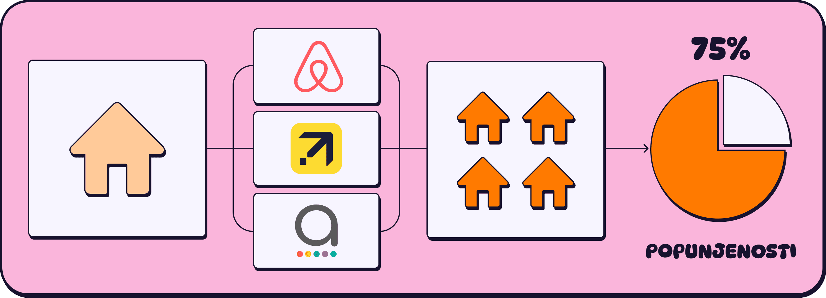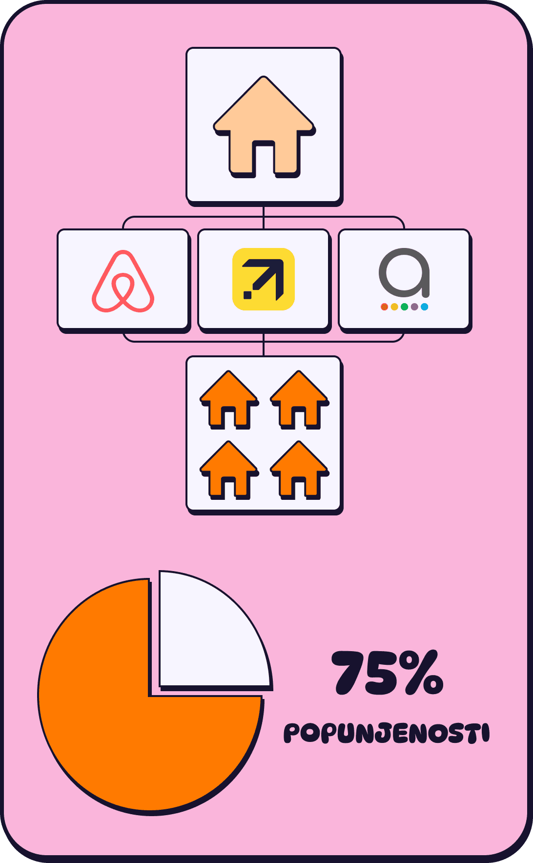 Minimum 75% popunjenosti zahvaljujući prisustvu na 120+ prodajnih platformi i dinamičkom određivanju cijena koje automatski prati tražnju i maksimizira tvoju zaradu.